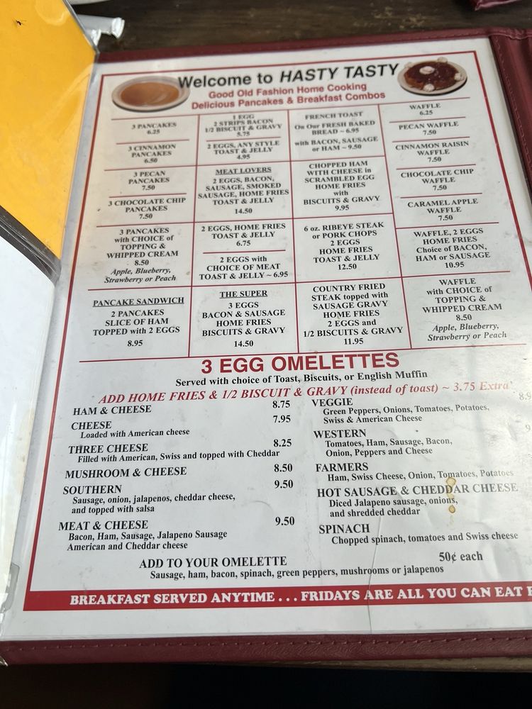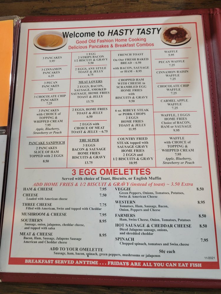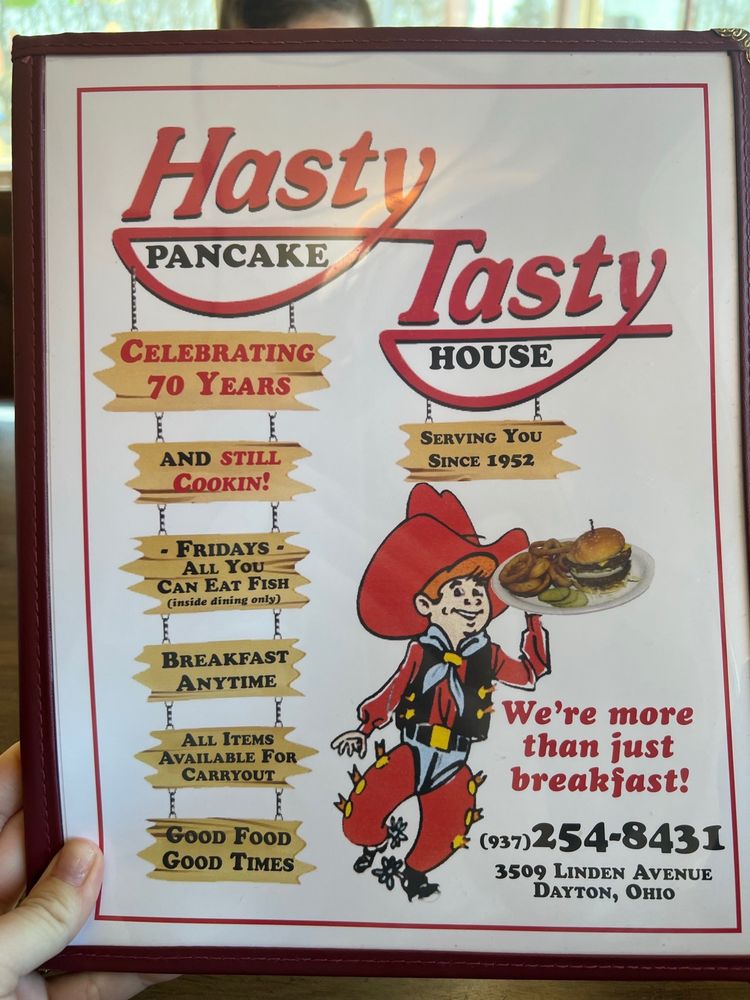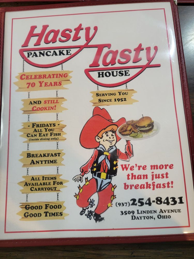 Welcome to Hasty Tasty Pancake House, a charming diner in Dayton, OH that offers a delightful dining experience filled with nostalgia and delicious home-cooked meals. Known for its 50s ambiance and friendly service, this spot is a local favorite for breakfast, brunch, lunch, and dinner. Customers rave about the large portion sizes, speedy service, and affordable prices. The diverse menu showcases a wide variety of options, including vegetarian choices, making it suitable for all diners. The decor, reminiscent of a classic American diner with a touch of kitsch, adds to the overall charm of the place. Whether you're craving fluffy pancakes, savory biscuits and gravy, or unique specials like Jalapeño sausage, Hasty Tasty is sure to satisfy your taste buds. Don't miss out on this hidden gem in the Dayton community – a visit to Hasty Tasty will surely leave you coming back for more.